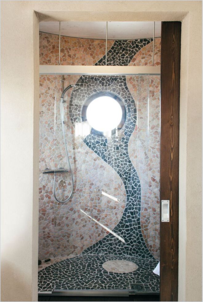 Vaikuttavin on kuitenkin suihkutila, jossa on upea mosaiikki kuvio seinässä. Vaikea uskoa, että tämä upea talo on ainoastaan 25 neliömetriä!