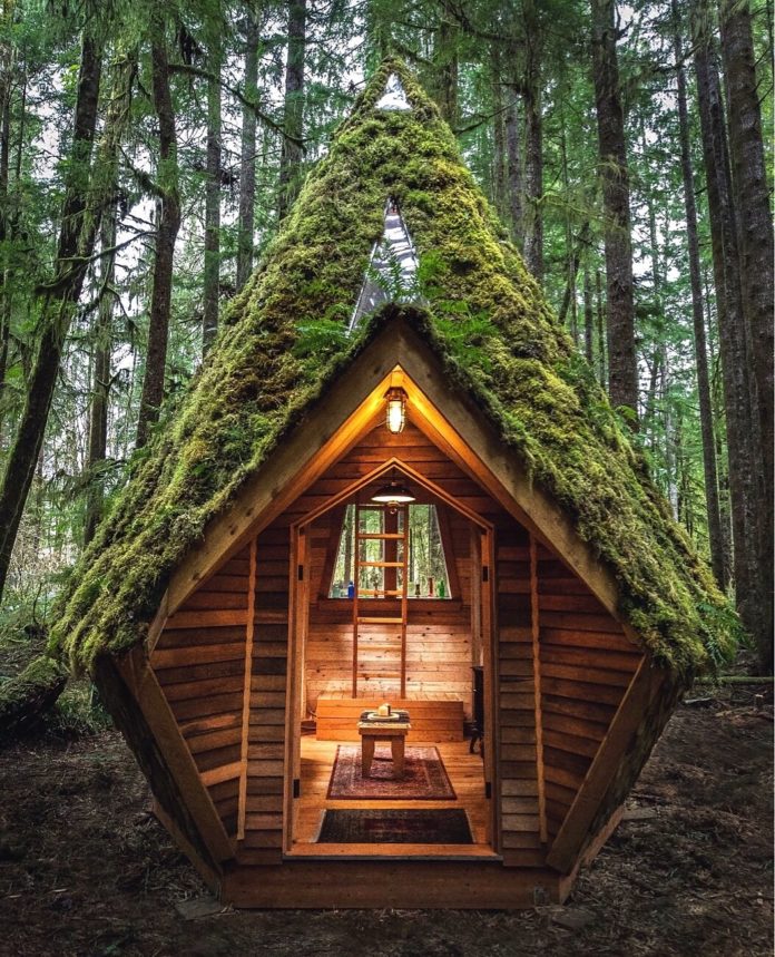 Inside the cabin, the comforts of home include electricity, a gas stove, and a sink with cold running water. For outdoor showering, water is warmed up by a propane on-demand tankless heater. Covered in moss, the cabin blends into its wooded surroundings, while standing out with its angular roofline.
