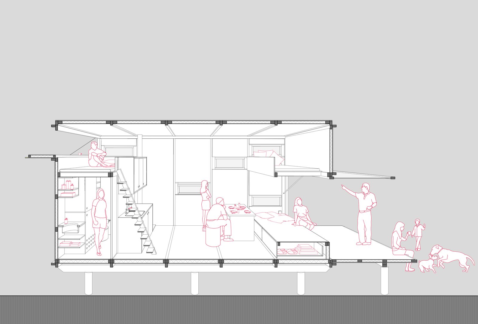 1A sectional drawing shows the space as it could be used with opened panels to the outdoors.
