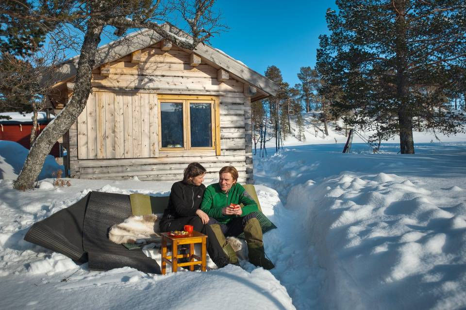 Bendik Manum and Annelise Bjerkan are enjoying a peaceful moment in front of their beautiful cabin. © Photo: Pasi Aalto