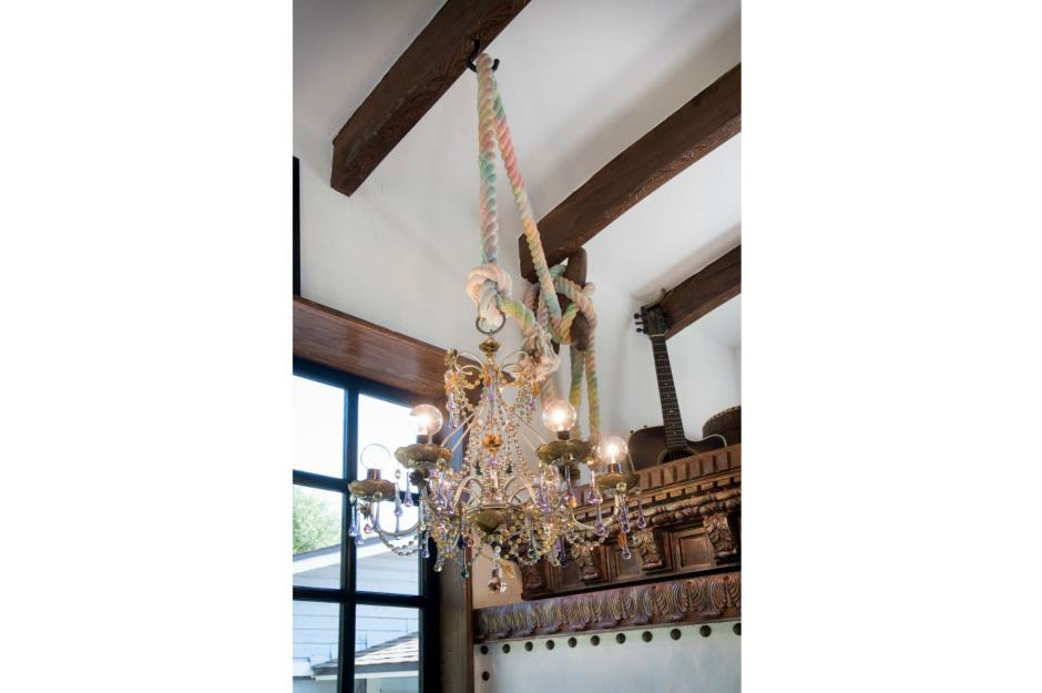 The rest of the home is full of gorgeous features including the amazing chandelier. Hanging from an amazing mermaid style multi-coloured rope the reclaimed piece sits above the living area.