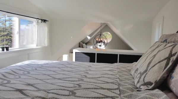 The unique curved ladder leads to a lofted bedroom, with plenty of room to sleep two. Natural light and spectacular views from the strategically-placed windows make it possible to feel right in the middle of it all
