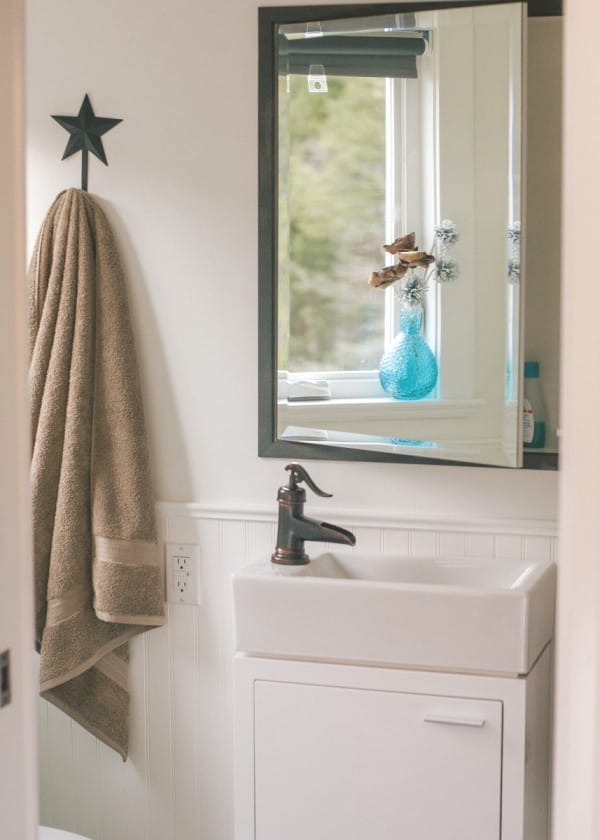 Right off of the kitchen, the full-sized bathroom also has a modern feel, while still providing views of the surrounding forest.